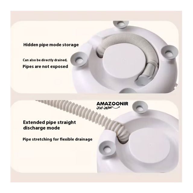 - روش تخلیه: دارای 4 مکنده در پایه برای چسباندن به سطح + یک لوله تخلیه برای خروج آب.