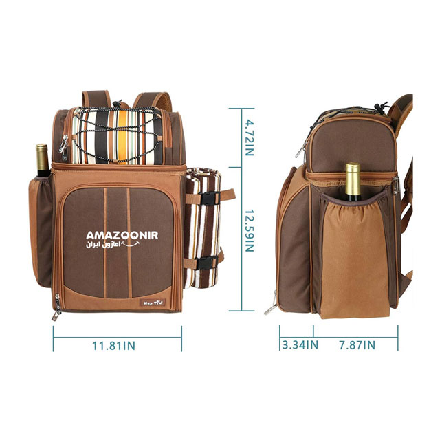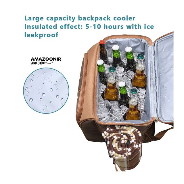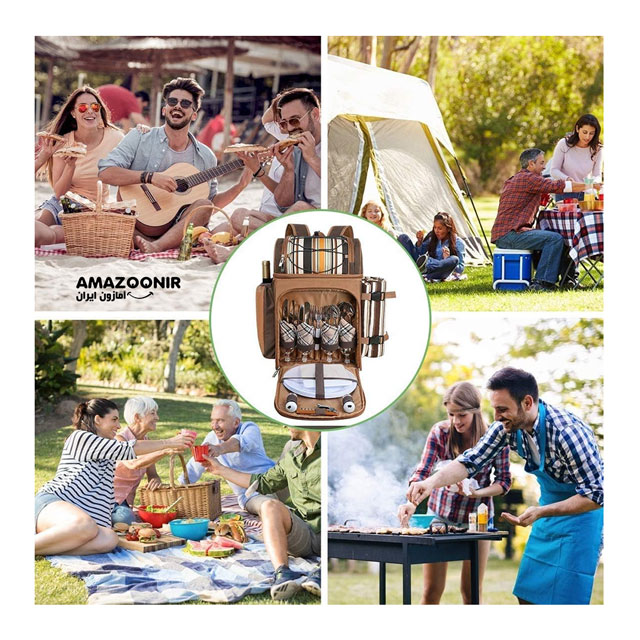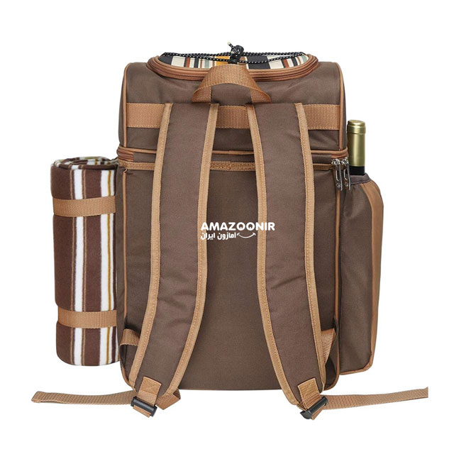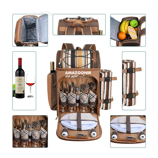 این کولهپشتی یک «پکیج کامل پیکنیک» است — یعنی همراه با خود کیف، تمام وسایل مورد نیاز برای صرف غذا بیرون را برای ۴ نفر دارد: کارد و چنگال و قاشق استیل، بشقاب، لیوان، پیشبند/دستمال، تخته برش، دربازکن بطری، نمکپاش و فلفلپاش و حتی پتو/زیرانداز ضدآب.