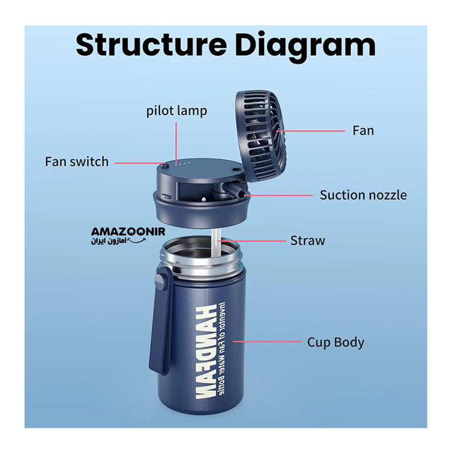 - دو درپوش قابل تعویض—یکی با نی (Straw) برای مصرف روزمره و دیگری با فن و پاوربانک برای فعالیتهای بیرونی