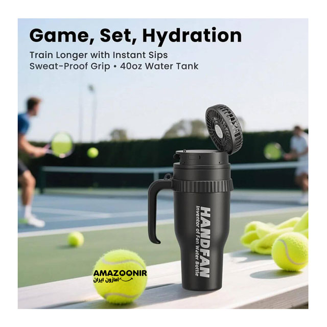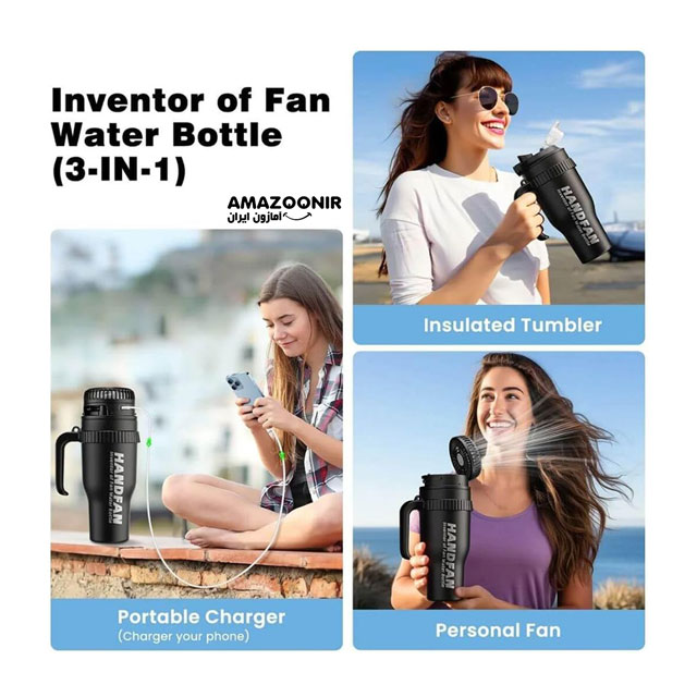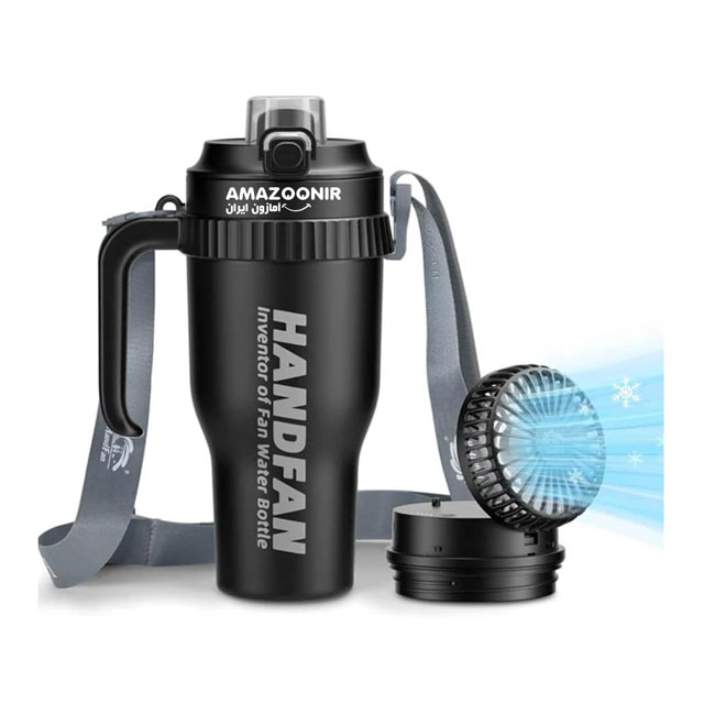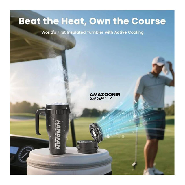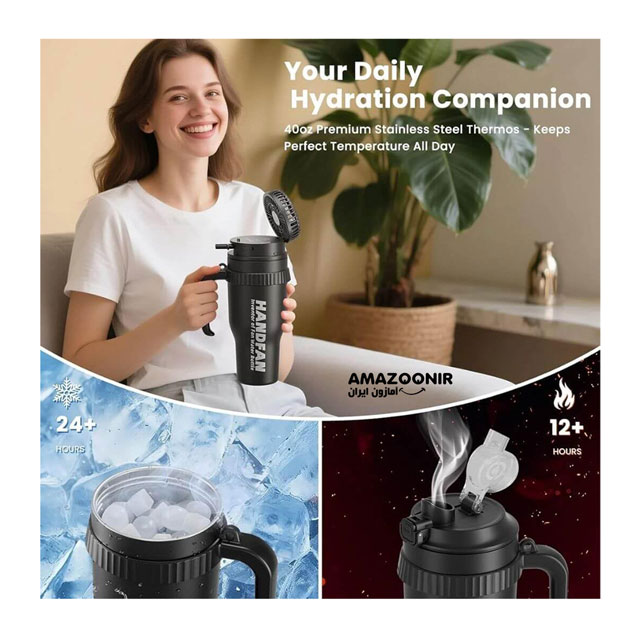 - دو درپوش قابل تعویض—یکی با نی (Straw) برای مصرف روزمره و دیگری با فن و پاوربانک برای فعالیتهای بیرونی