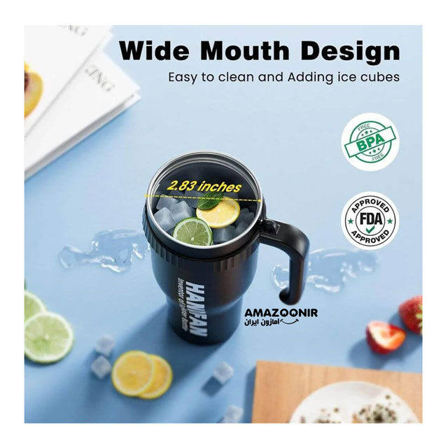 ظرفیت بالا: گنجایش ۴۰ اونس (۱٫۱۸ لیتر) با دهانهی پهن که امکان استفاده از قالبهای یخ استاندارد و شستوشوی آسان را فراهم میکند.