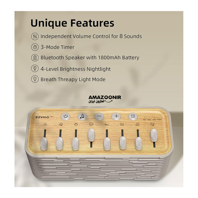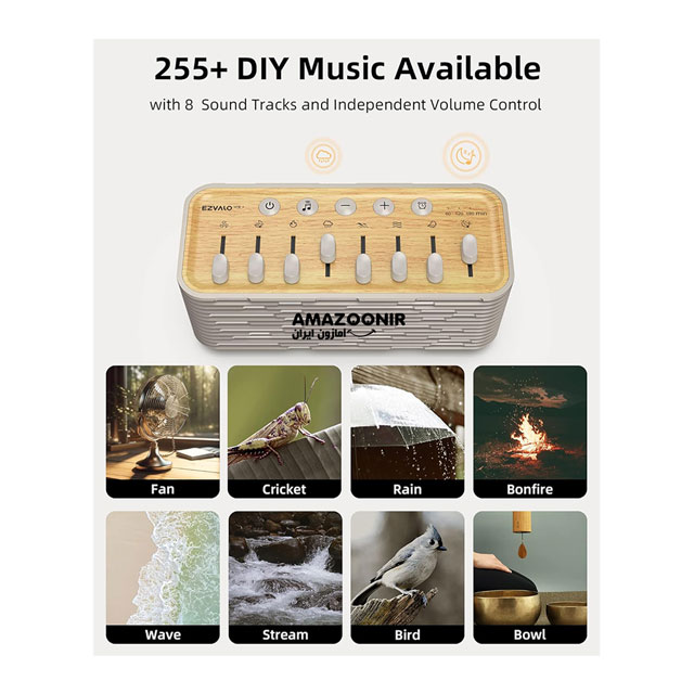 این دستگاه دارای ۵ صدای پایه مثل صدای فن، آب، پرنده، موج دریا و… است که با استفاده از ۵ دکمه اسلایدری، میتوان آنها را با هم ترکیب کرد و به بیش از ۲۵۵ حالت صدای منحصربهفرد دست یافت. این قابلیت باعث میشود که بتوانی صدایی شخصیسازیشده برای خواب یا تمرکز ایجاد کنی.